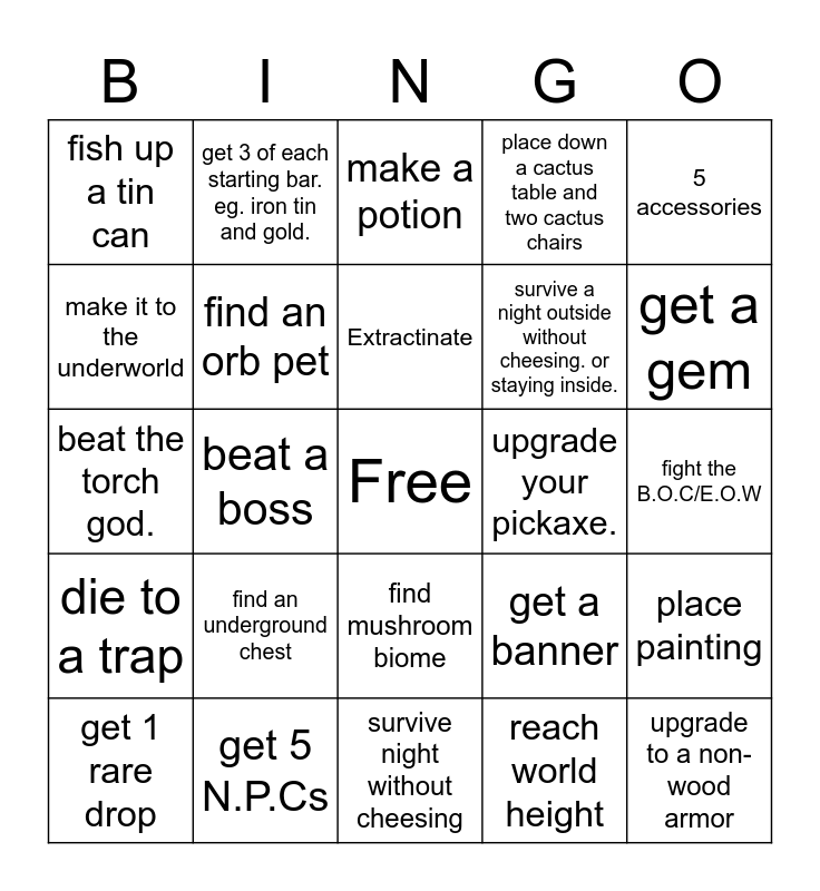 This bingo card has a free space and 24 words: find an underground chest, get 5 N.P.Cs, Extractinate, get 1 rare drop, 5 accessories, fish up a tin can, make it to the underworld, get 3 of each starting bar. eg. iron tin and gold., upgrade your pickaxe., find mushroom biome, survive a night outside without cheesing. or staying inside., beat the torch god., get a banner, place painting, find an orb pet, reach world height, fight the B.O.C/E.O.W, make a potion, get a gem, beat a boss, upgrade to a non-wood armor, die to a trap, place down a cactus table and two cactus chairs and survive night without cheesing.