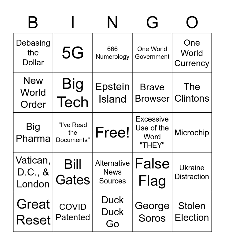 This bingo card has a free space and 24 words: Bill Gates, COVID Patented, Epstein Island, Great Reset, One World Currency, Debasing the Dollar, New World Order, 5G, Excessive Use of the Word "THEY", Alternative News Sources, Brave Browser, Big Pharma, False Flag, Ukraine Distraction, Big Tech, George Soros, Microchip, 666 Numerology, The Clintons, "I've Read the Documents", Stolen Election, Vatican, D.C., & London, One World Government and Duck Duck Go.