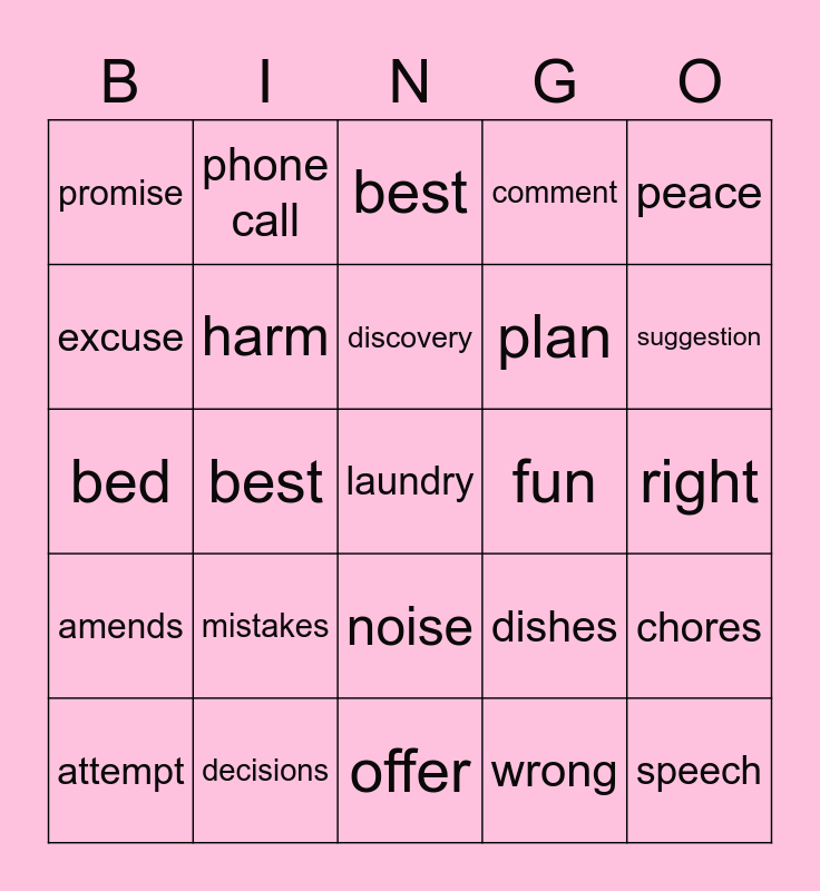 This bingo card has a free space and 24 words: mistakes, decisions, discovery, attempt, peace, promise, excuse, phone call, fun, noise, plan, bed, dishes, chores, harm, wrong, right, best, suggestion, best, speech, amends, comment and offer.