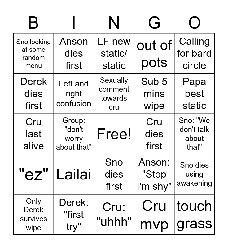This bingo card has a free space and 24 words: Lailai, Derek: "first try", Sexually comment towards cru, Only Derek survives wipe, Calling for bard circle, Sno looking at some random menu, Derek dies first, Anson dies first, Cru dies first, Sno dies first, Sub 5 mins wipe, Cru last alive, Anson: "Stop I'm shy", Sno dies using awakening, Left and right confusion, Cru mvp, Sno: "We don't talk about that", LF new static/ static, Papa best static, Group: "don't worry about that", touch grass, "ez", out of pots and Cru: "uhhh".