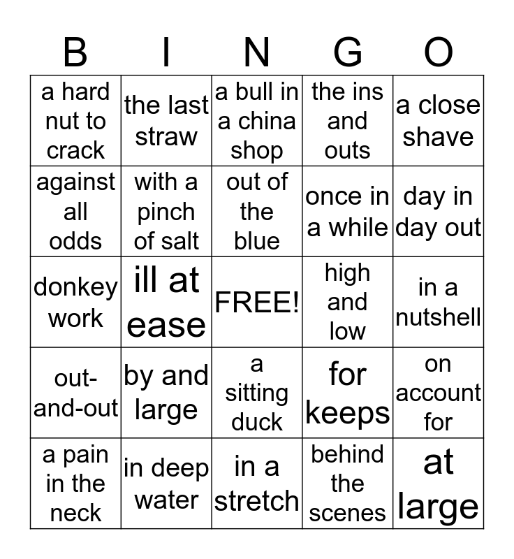 This bingo card has a free space and 37 words: in good time, by all means, time and again, with a pinch of salt, on account for, by and large, out of the blue, wet blanket, a close shave, on the dole, ill at ease, the ins and outs, at large, in a nutshell, against all odds, out-and-out, an old wives' tale, a bull in a china shop, a sitting duck, high and low, a hard nut to crack, day in day out, a pain in the neck, in a stretch, off the record, behind the scenes, the last straw, for the time being, in the nick of time, on second thoughts, no wonder, in deep water, donkey work, a blind alley, for keeps, once in a while and in good time.