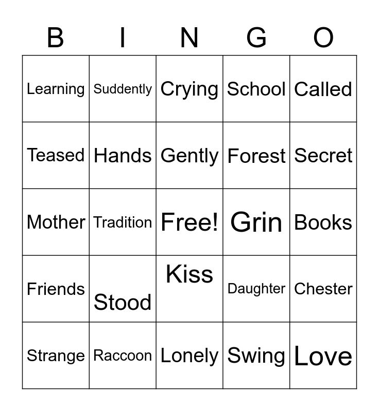 This bingo card has a free space and 24 words: Stood, Raccoon, Gently, Strange, Called, Learning, Teased, Suddently, Grin, Kiss, Forest, Mother, Daughter, Chester, Hands, Swing, Books, Crying, Secret, Tradition, Love, Friends, School and Lonely.