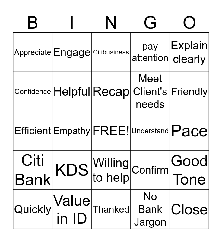 This bingo card has a free space and 24 words: KDS, Value in ID, Recap, Quickly, Explain clearly, Appreciate, Confidence, Engage, Understand, Willing to help, Meet Client's needs, Efficient, Confirm, Good Tone, Helpful, No Bank Jargon, Pace, Citibusiness, Friendly, Empathy, Close, Citi Bank, pay attention and Thanked.