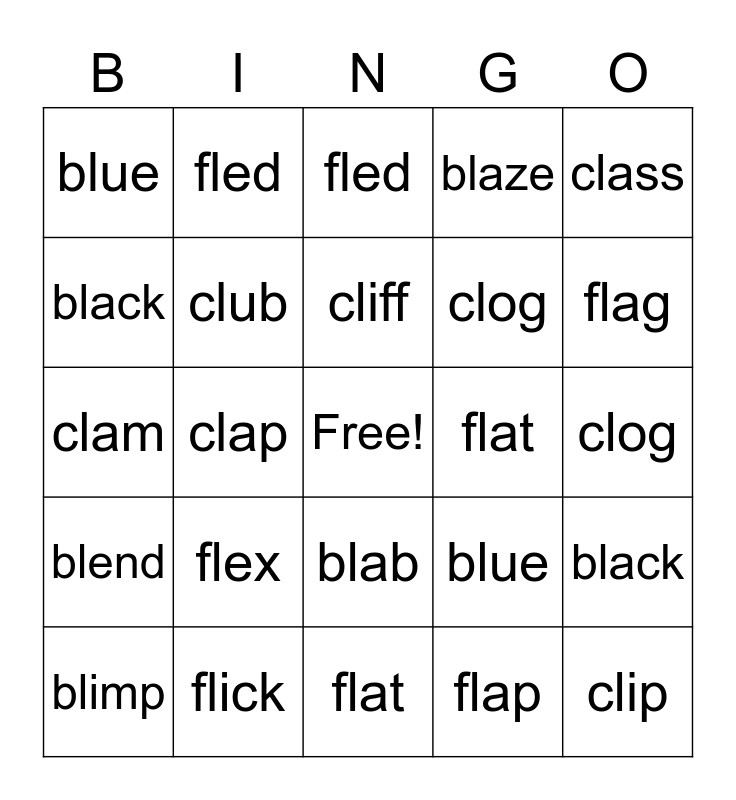 ⚠ This card has duplicate items: blend (4), cliff (2), flop (2), flex (2), flap (2), black (2), fled (2), blab (2), clog (2), flag (2), clap (2), class (2), blue (2), clam (2), flat (2)