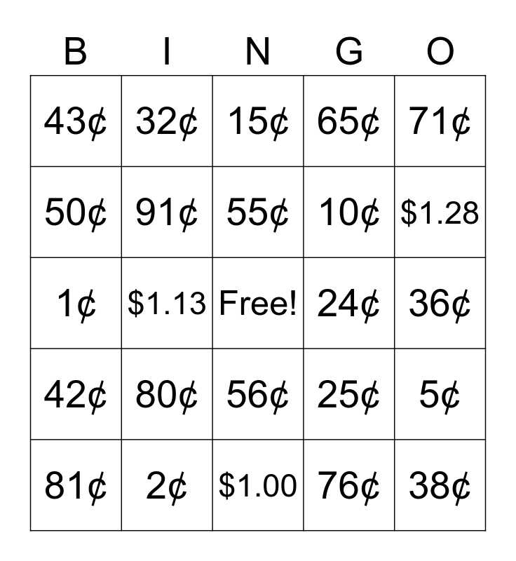 This bingo card has a free space and 24 words: 80¢, 2¢, 55¢, 81¢, 71¢, 43¢, 50¢, 32¢, 24¢, 56¢, 10¢, 1¢, 25¢, 5¢, 91¢, 76¢, 36¢, 15¢, $1.28, $1.13, 38¢, 42¢, 65¢ and $1.00.