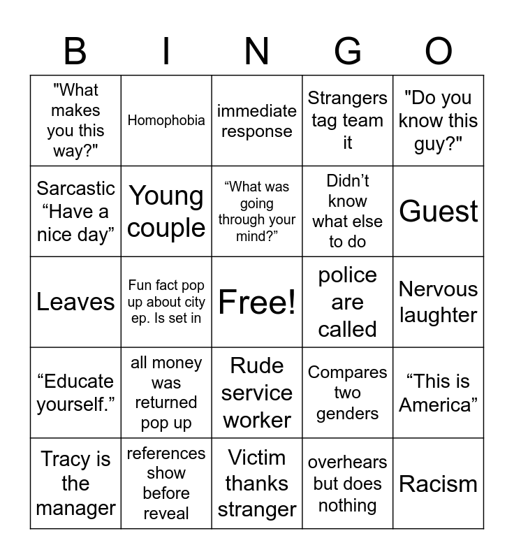 This bingo card has a free space and 44 words: stranger is a sheep, Racism, someone goes to the bathroom, Tracy is the manager, Strange coincidence, overhears but does nothing, immediate response, Cries, "Do you know this guy?", references show before reveal, Strangers tag team it, police are called, Rude service worker, all money was returned pop up, "I'm just trying to do my job", Victim thanks stranger, "Why are you helping a stranger?", Leaves, Sexism, Guest, Homophobia, Stranger talks to manager, Agrees but doesn't like approach, "What makes you this way?", “it’s none of your business”, Nervous laughter, Mid-episode history lesson, Two different locations, Compares two genders, “Educate yourself.”, “Let it go”, “This is America”, Referenced rights, Freezeframe, Fun fact pop up about city ep. Is set in, Checks in after actor(s) leaves, Cliche quote, “Come sit with us”, “What was going through your mind?”, Sarcastic “Have a nice day”, Didn’t know what else to do, Table of college students, Young couple and Homeless person involved.