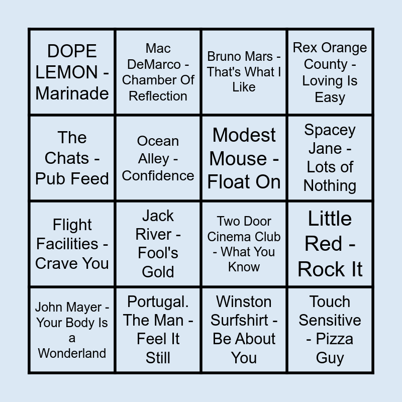 This bingo card has 63 words: Ocean Alley - Knees, Sticky Fingers - Australia Street, BENEE - Find an Island, Lime Cordiale - Dirt Cheap, Hockey Dad - Seaweed, San Cisco - Awkward, Mac DeMarco - Chamber Of Reflection, The Temper Trap - Sweet Disposition, Spacey Jane - Lots of Nothing, The Jungle Giants - Heavy Hearted, Tame Impala - The Less I Know The Better, Methyl Ethel - Ubu, Winston Surfshirt - Be About You, The Chats - Pub Feed, Violent Soho - Covered in Chrome, Ocean Alley - Confidence, Little Red - Rock It, DOPE LEMON - Marinade, Holy Holy - True Lovers, Flight Facilities - Crave You, RÜFÜS DU SOL - You Were Right, Touch Sensitive - Pizza Guy, Rex Orange County - Loving Is Easy, Weezer - Island In The Sun, Phoenix - 1901, Gang of Youths - Let Me Down Easy, Ou Est Le Swimming Pool - Dance The Way I Feel, Ladyhawke - My Delirium, Ball Park Music - Exactly How You Are, Marcus Marr - The Trouble with Us, Foals - My Number, Edward Sharpe & The Magnetic Zeros - Home, The Kooks - Naive, Chance the Rapper - All Night (feat. Knox Fortune), Jack River - Fool's Gold, Passion Pit - Little Secrets, M83 - Midnight City, The Drums - Lets Go Surfing, The Strokes - Last Nite, Modest Mouse - Float On, Two Door Cinema Club - What You Know, Portugal. The Man - Feel It Still, The Beach Boys - Surfin' U.S.A., Prince - I Wanna Be Your Lover, John Mayer - Your Body Is a Wonderland, Red Hot Chili Peppers - Under the Bridge, INXS - New Sensation, Violent Femmes - Blister In The Sun, The Darkness - I Believe in a Thing Called Love, The Killers - Mr. Brightside, The Clash - Rock the Casbah, Gorillaz - Feel Good Inc., Jet - Are You Gonna Be My Girl, blink-182 - What's My Age Again?, Khalid - Talk, Bruno Mars - That's What I Like, Paul Simon - You Can Call Me Al, Fleetwood Mac - Dreams, M.I.A. - Paper Planes, The Buggles - Video Killed The Radio Star, Franz Ferdinand - Take Me Out, Spacey Jane - Booster Seat and Doja Cat - Kiss Me More (feat. SZA).