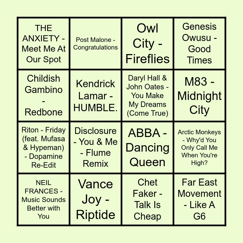 This bingo card has 63 words: Rockwell - Somebody's Watching Me, Glass Animals - Heat Waves, Lil Nas X - INDUSTRY BABY (feat. Jack Harlow), Grover Washington, Jr. - Just the Two of Us (feat. Bill Withers), Lil Nas X - MONTERO (Call Me By Your Name), Client Liaison - World Of Our Love, Post Malone - Congratulations, Kendrick Lamar - King Kunta, M83 - Midnight City, Kanye West - Stronger, Nelly Furtado - Maneater, Touch Sensitive - Lay Down, Chet Faker - Talk Is Cheap, Childish Gambino - Redbone, Disclosure - Latch, Kendrick Lamar - HUMBLE., Arctic Monkeys - Why'd You Only Call Me When You're High?, THE ANXIETY - Meet Me At Our Spot, The Weeknd - Blinding Lights, Riton - Friday (feat. Mufasa & Hypeman) - Dopamine Re-Edit, Justin Bieber - Peaches (feat. Daniel Caesar & Giveon), Far East Movement - Like A G6, Genesis Owusu - Good Times, Elton John - Cold Heart - PNAU Remix, ACRAZE - Do It To It, Frank Ocean - Lost, Yothu Yindi - Treaty, bbno$ - edamame (feat. Rich Brian), Luude - Down Under (feat. Colin Hay), The Wiggles - Elephant - triple j Like A Version, Mac Miller - The Spins, Savage Garden - Truly Madly Deeply, Oliver Tree - Life Goes On, A-Wall - Loverboy, Disclosure - You & Me - Flume Remix, Majestic - Rasputin, Mura Masa - Love$ick, Faith No More - Easy, Stardust - Music Sounds Better With You, Daryl Hall & John Oates - You Make My Dreams (Come True), ABBA - Dancing Queen, Vance Joy - Riptide, The Presets - Downtown Shutdown, Frank Ocean - Chanel, NEIL FRANCES - Music Sounds Better with You, Flume - The Difference, Estelle - American Boy, Glass Animals - Heat Waves (with iann dior), Bruno Mars - Smokin Out The Window, The Weeknd - Take My Breath, Kim Carnes - Bette Davis Eyes, Metro Station - Shake It, Nelly Furtado - Say It Right, Kanye West - Flashing Lights, Vanessa Carlton - A Thousand Miles, Owl City - Fireflies, Marvin Gaye - Sexual Healing, Cold Chisel - Flame Trees, Red Hot Chili Peppers - Can't Stop, Go West - The King of Wishful Thinking, a-ha - Take on Me, Vampire Weekend - A-Punk and Third Eye Blind - Semi-Charmed Life.