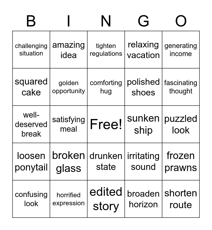 This bingo card has a free space and 24 words: broken glass, horrified expression, comforting hug, confusing look, generating income, challenging situation, squared cake, amazing idea, sunken ship, drunken state, polished shoes, well-deserved break, irritating sound, frozen prawns, golden opportunity, broaden horizon, puzzled look, tighten regulations, fascinating thought, satisfying meal, shorten route, loosen ponytail, relaxing vacation and edited story.