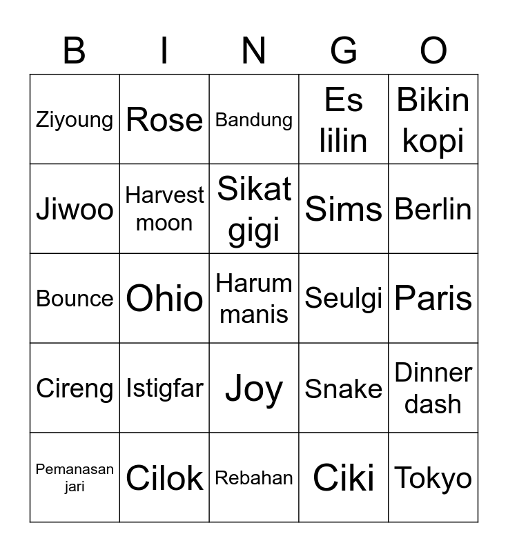 This bingo card has 25 words: Istigfar, Rebahan, Sikat gigi, Pemanasan jari, Bikin kopi, Ziyoung, Jiwoo, Rose, Seulgi, Joy, Sims, Bounce, Snake, Dinner dash, Harvest moon, Tokyo, Paris, Bandung, Berlin, Ohio, Harum manis, Cilok, Cireng, Es lilin and Ciki.