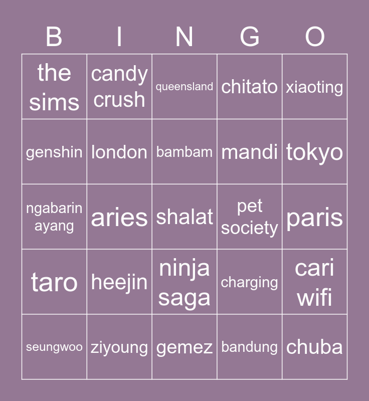 This bingo card has a free space and 24 words: heejin, ziyoung, bambam, seungwoo, xiaoting, the sims, genshin, candy crush, pet society, ninja saga, mandi, ngabarin ayang, charging, cari wifi, london, bandung, paris, queensland, tokyo, aries, chuba, taro, chitato and gemez.