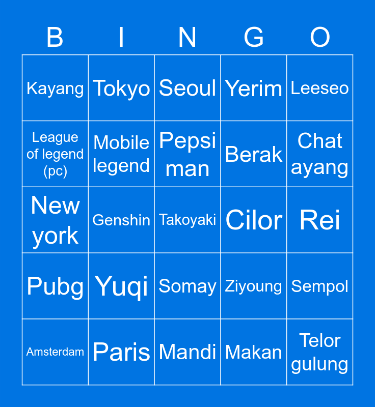This bingo card has 25 words: Yuqi, Mandi, Pepsi man, Amsterdam, Leeseo, Kayang, League of legend (pc), Tokyo, Cilor, Somay, Berak, New york, Ziyoung, Sempol, Mobile legend, Telor gulung, Rei, Seoul, Chat ayang, Genshin, Takoyaki, Paris, Pubg, Yerim and Makan.