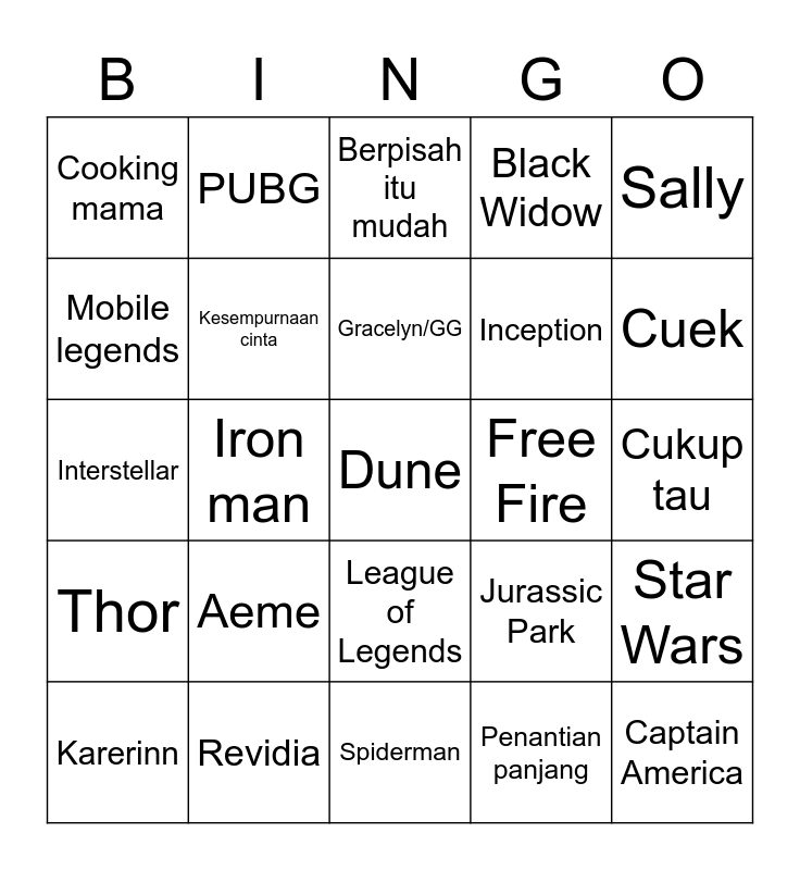 This bingo card has a free space and 24 words: Aeme, Revidia, Gracelyn/GG, Karerinn, Sally, Cooking mama, Mobile legends, PUBG, Free Fire, League of Legends, Inception, Interstellar, Jurassic Park, Star Wars, Kesempurnaan cinta, Penantian panjang, Cukup tau, Berpisah itu mudah, Cuek, Iron man, Captain America, Thor, Black Widow and Spiderman.
