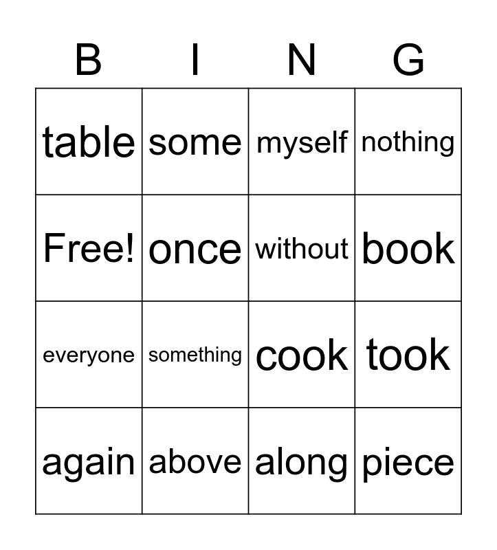 This bingo card has 16 words: above, took, myself, table, everyone, some, cook, along, Free!, once, again, nothing, something, book, without and piece.