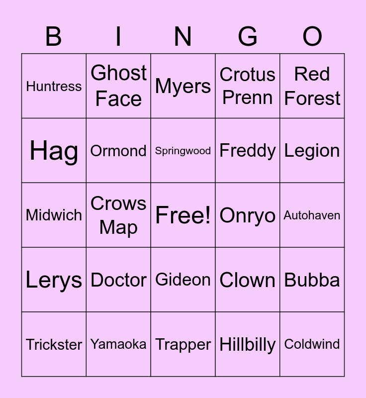 This bingo card has a free space and 41 words: RPD, Midwich, Dead Dawg, Ormond, Yamaoka, Gideon, Springwood, Swamp, Red Forest, Lerys, Crows Map, Crotus Prenn, Coldwind, Autohaven, Onryo, Doctor, Nemesis, Huntress, Pinhead, Myers, Bubba, Demo, Trapper, Freddy, Bing Bong, Blight, Hillbilly, Executioner, Legion, Nurse, Deathslinger, Ghost Face, Trickster, Artist, Clown, Hag, Spirit, Plague, Oni, Pig and Twins.