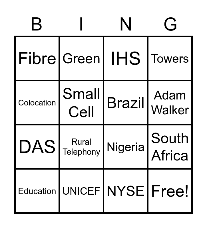 This bingo card has 23 words: Free!, Sam Darwish, Adam Walker, WIIN, Colocation, Fibre, Small Cell, Green, Education, Frontline Workers, Rural Telephony, DAS, Infrastructure, Giga, UNICEF, 2001, IHS, Nigeria, Brazil, South Africa, Towers, NYSE and Telecoms.