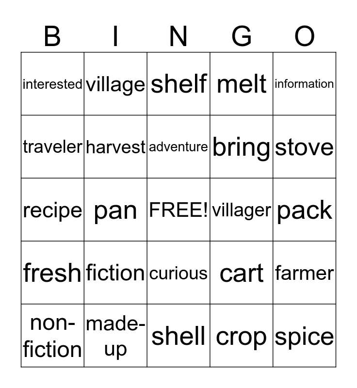 This bingo card has a free space and 24 words: fiction, made-up, adventure, non-fiction, information, interested, traveler, village, villager, curious, bring, recipe, cart, farmer, harvest, crop, pack, shelf, stove, pan, spice, fresh, melt and shell.