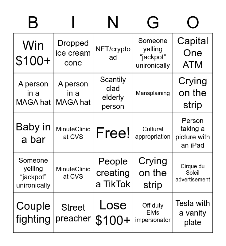 This bingo card has a free space and 55 words: Cirque du Soleil advertisement, Couple fighting, Criss Angel in the flesh, Win $100+, Lose $100+, See someone you know, A person in a MAGA hat, Baby in a bar, Mansplaining, Ryan talks about aviation with a stranger, Someone yelling “jackpot” unironically, Erin gets too intoxicated, Bachelor/ette party, Dropped ice cream cone, “Call Me Maybe” playing, Jamie gets angry about slot machines, Capital One ATM, MinuteClinic at CVS, Street preacher, Tesla with a vanity plate, Cultural appropriation, “Come and take it”, Crying on the strip, NFT/crypto ad, Whippet/popper canister, Scantily clad elderly person, Off duty Elvis impersonator, People creating a TikTok, Person taking a picture with an iPad, Cirque du Soleil advertisement, Couple fighting, Criss Angel in the flesh, Win $100+, See someone you know, A person in a MAGA hat, Baby in a bar, Ryan talks about aviation with a stranger, Someone yelling “jackpot” unironically, Erin gets too intoxicated, Bachelor/ette party, Dropped ice cream cone, “Call Me Maybe” playing, Jamie gets angry about slot machines, Capital One ATM, MinuteClinic at CVS, Street preacher, Tesla with a vanity plate, Cultural appropriation, “Come and take it”, Crying on the strip, Whippet/popper canister, Scantily clad elderly person, Off duty Elvis impersonator, People creating a TikTok and Person taking a picture with an iPad.