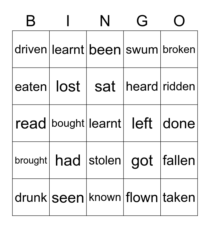 This bingo card has 35 words: given, felt, found, lost, stolen, swum, eaten, worn, sat, spoken, read, broken, made, won, driven, left, flown, bought, brought, learnt, got, drunk, fallen, seen, been, ridden, taken, met, heard, done, thought, known, had, learnt and told.