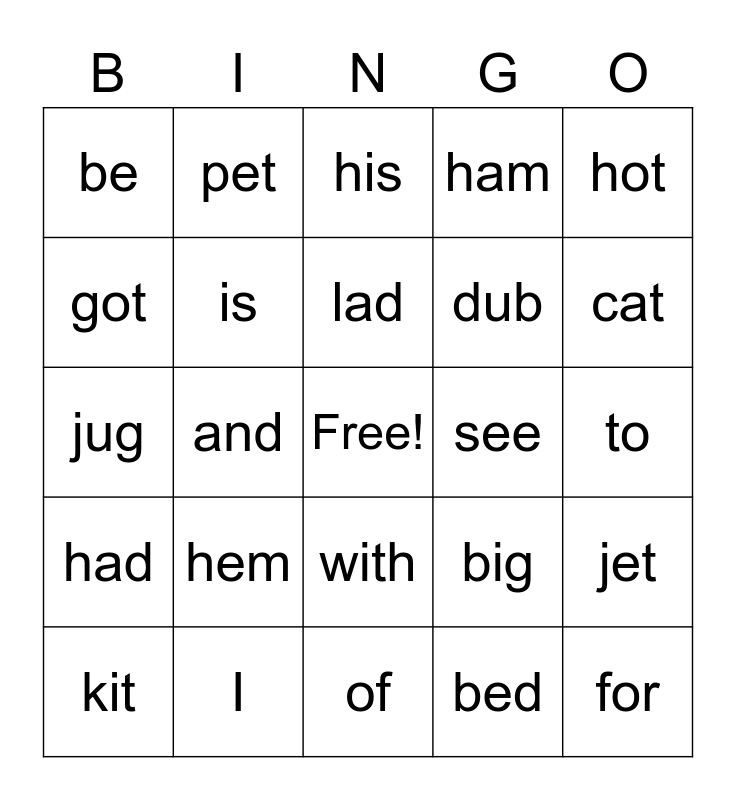 This bingo card has a free space and 30 words: I, a, and, the, be, his, is, with, see, of, to, for, bed, dog, cat, cup, big, had, hem, hot, jug, tip, pet, dub, got, ham, jet, kit, lad and cob.