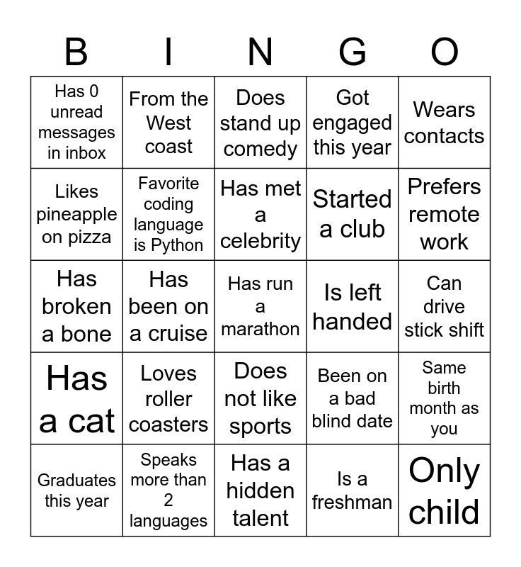 This bingo card has a free space and 24 words: Loves roller coasters, Speaks more than 2 languages, Has met a celebrity, Graduates this year, Wears contacts, Has 0 unread messages in inbox, Likes pineapple on pizza, From the West coast, Is left handed, Does not like sports, Started a club, Has broken a bone, Been on a bad blind date, Same birth month as you, Favorite coding language is Python, Is a freshman, Can drive stick shift, Does stand up comedy, Prefers remote work, Has been on a cruise, Only child, Has a cat, Got engaged this year and Has a hidden talent.