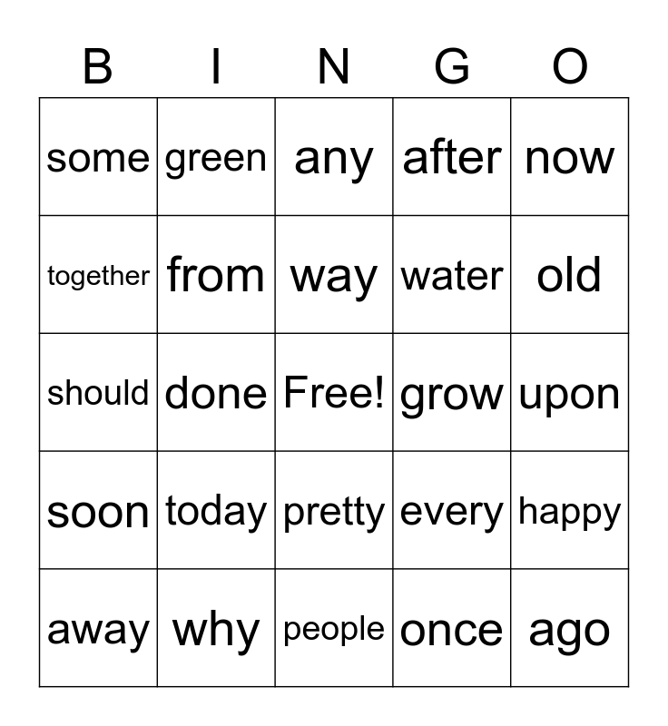 This bingo card has a free space and 24 words: today, why, way, away, now, some, together, green, grow, pretty, water, should, every, happy, from, once, upon, any, old, done, ago, soon, after and people.