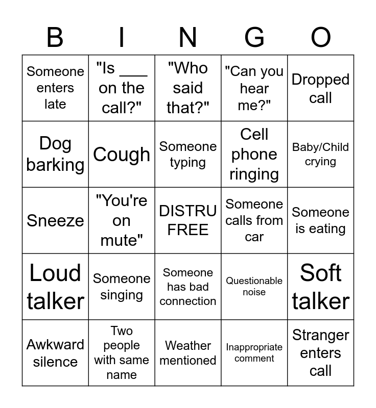 This bingo card has a free space and 24 words: Someone singing, Two people with same name, Someone typing, Awkward silence, Dropped call, Someone enters late, Dog barking, "Is ___ on the call?", Someone calls from car, Someone has bad connection, Cell phone ringing, Sneeze, Questionable noise, Soft talker, Cough, Inappropriate comment, Someone is eating, "Who said that?", Baby/Child crying, "You're on mute", Stranger enters call, Loud talker, "Can you hear me?" and Weather mentioned.