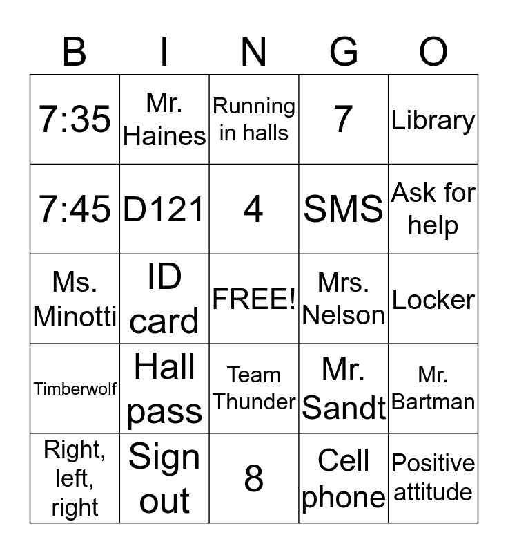 This bingo card has a free space and 24 words: Hall pass, Sign out, 4, Right, left, right, Library, 7:35, 7:45, Mr. Haines, Mrs. Nelson, Team Thunder, SMS, Ms. Minotti, Mr. Sandt, Mr. Bartman, D121, Cell phone, Locker, Running in halls, Ask for help, ID card, Positive attitude, Timberwolf, 7 and 8.