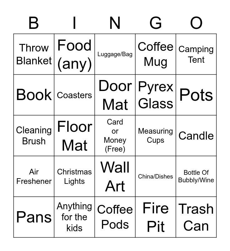 This bingo card has a free space and 25 words: Christmas Lights, Coffee Pods, Door Mat, Pans, Camping Tent, Throw Blanket, Book, Food (any), Measuring Cups, Wall Art, Pyrex Glass, Cleaning Brush, China/Dishes, Bottle Of Bubbly/Wine, Coasters, Toilet Brush, Candle, Luggage/Bag, Pots, Floor Mat, Trash Can, Anything for the kids, Air Freshener, Coffee Mug and Fire Pit.