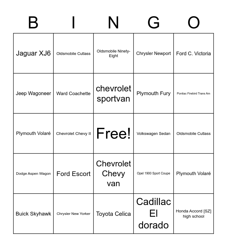 This bingo card has a free space and 26 words: Chevrolet Chevy van, Cadillac El dorado, chevrolet sportvan, Chrysler New Yorker, Ford C. Victoria, Jaguar XJ6, Jeep Wagoneer, Oldsmobile Cutlass, Oldsmobile Cutlass, Opel 1900 Sport Coupe, Plymouth Fury, Plymouth Volaré, Plymouth Volaré, Buick Skyhawk, Chevrolet Chevy II, Chevrolet Nova, Chrysler Newport, Dodge Aspen Wagon, Oldsmobile Ninety-Eight, Honda Accord [SZ] high school, Pontiac Firebird Trans Am, Toyota Celica, Volkswagen Sedan, Ford Escort, Ward Coachette and Chevrolet Sportvan.