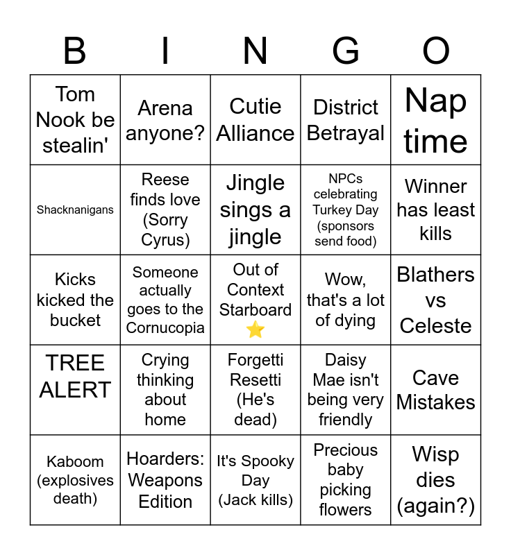 This bingo card has a free space and 24 words: Crying thinking about home, Hoarders: Weapons Edition, Jingle sings a jingle, Kaboom (explosives death), Nap time, Tom Nook be stealin', Shacknanigans, Arena anyone?, Wow, that's a lot of dying, Forgetti Resetti (He's dead), NPCs celebrating Turkey Day (sponsors send food), Kicks kicked the bucket, Daisy Mae isn't being very friendly, Cave Mistakes, Reese finds love (Sorry Cyrus), Precious baby picking flowers, Blathers vs Celeste, Cutie Alliance, Winner has least kills, Someone actually goes to the Cornucopia, Wisp dies (again?), TREE ALERT, District Betrayal and It's Spooky Day (Jack kills).