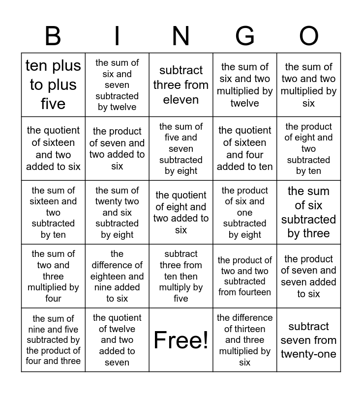 This bingo card has 25 words: the sum of two and three multiplied by four, the quotient of twelve and two added to seven, the quotient of eight and two added to six, the difference of thirteen and three multiplied by six, the sum of two and two multiplied by six, ten plus to plus five, the sum of six and seven subtracted by twelve, subtract three from eleven, the product of six and one subtracted by eight, the product of seven and seven added to six, the quotient of sixteen and two added to six, the product of seven and two added to six, Free!, the product of two and two subtracted from fourteen, the product of eight and two subtracted by ten, the sum of nine and five subtracted by the product of four and three, the sum of twenty two and six subtracted by eight, the sum of five and seven subtracted by eight, the quotient of sixteen and four added to ten, the sum of six subtracted by three, the sum of sixteen and two subtracted by ten, the difference of eighteen and nine added to six, subtract three from ten then multiply by five, the sum of six and two multiplied by twelve and subtract seven from twenty-one.