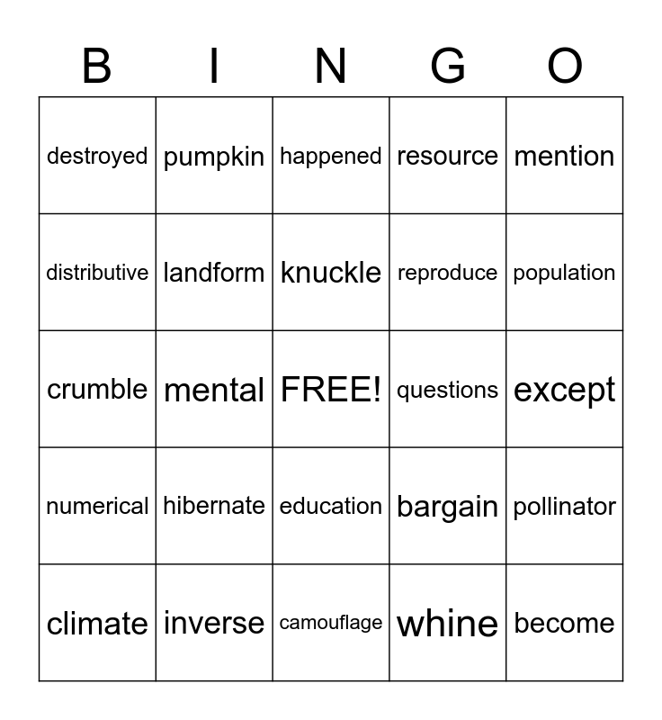 This bingo card has a free space and 27 words: bargain, absolute, reproduce, camouflage, distributive, happened, pumpkin, numerical, questions, pollinator, crumble, resource, climate, inverse, population, nutrients, landform, knuckle, hibernate, destroyed, except, whine, mental, become, education, mention and tension.
