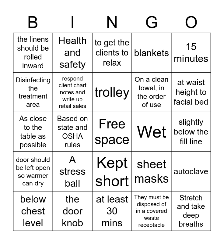 This bingo card has a free space and 24 words: A stress ball, the door knob, trolley, below chest level, 15 minutes, the linens should be rolled inward, Disinfecting the treatment area, Health and safety, Wet, Kept short, On a clean towel, in the order of use, As close to the table as possible, sheet masks, autoclave, respond client chart notes and write up retail sales, They must be disposed of in a covered waste receptacle, slightly below the fill line, to get the clients to relax, at waist height to facial bed, Based on state and OSHA rules, Stretch and take deep breaths, door should be left open so warmer can dry, blankets and at least 30 mins.