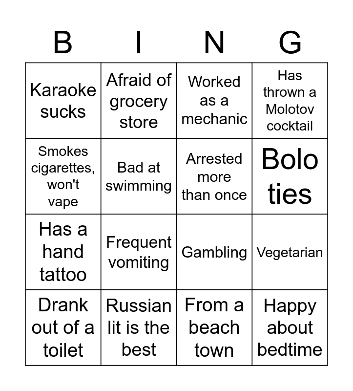 This bingo card has 16 words: Russian lit is the best, Vegetarian, Worked as a mechanic, Karaoke sucks, Has a hand tattoo, Afraid of grocery store, Gambling, From a beach town, Smokes cigarettes, won't vape, Bad at swimming, Drank out of a toilet, Has thrown a Molotov cocktail, Frequent vomiting, Bolo ties, Arrested more than once and Happy about bedtime.