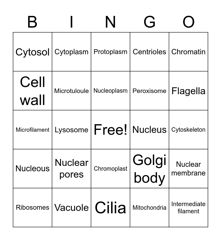 This bingo card has a free space and 24 words: Nuclear pores, Vacuole, Nucleoplasm, Ribosomes, Chromatin, Cytosol, Cell wall, Cytoplasm, Nucleus, Chromoplast, Peroxisome, Microfilament, Golgi body, Nuclear membrane, Microtuloule, Mitochondria, Cytoskeleton, Protoplasm, Flagella, Lysosome, Intermediate filament, Nucleous, Centrioles and Cilia.