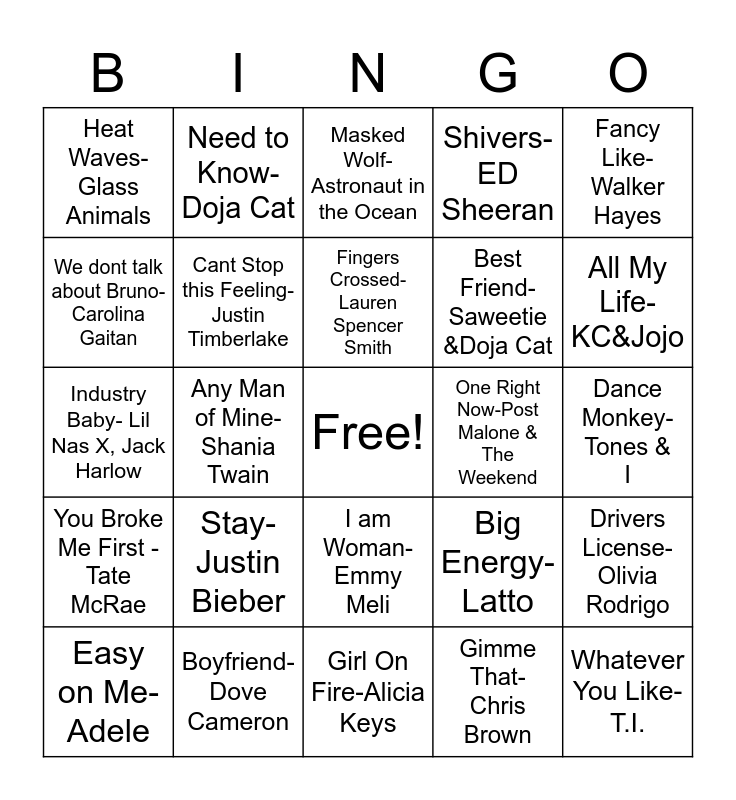 This bingo card has a free space and 24 words: Stay-Justin Bieber, Boyfriend- Dove Cameron, Fingers Crossed-Lauren Spencer Smith, Easy on Me- Adele, Fancy Like-Walker Hayes, Heat Waves-Glass Animals, We dont talk about Bruno-Carolina Gaitan, Need to Know- Doja Cat, One Right Now-Post Malone & The Weekend, I am Woman-Emmy Meli, Best Friend-Saweetie &Doja Cat, Industry Baby- Lil Nas X, Jack Harlow, Big Energy- Latto, Drivers License-Olivia Rodrigo, Cant Stop this Feeling- Justin Timberlake, Gimme That-Chris Brown, Dance Monkey- Tones & I, Masked Wolf-Astronaut in the Ocean, All My Life-KC&Jojo, Any Man of Mine-Shania Twain, Whatever You Like-T.I., You Broke Me First -Tate McRae, Shivers-ED Sheeran and Girl On Fire-Alicia Keys.