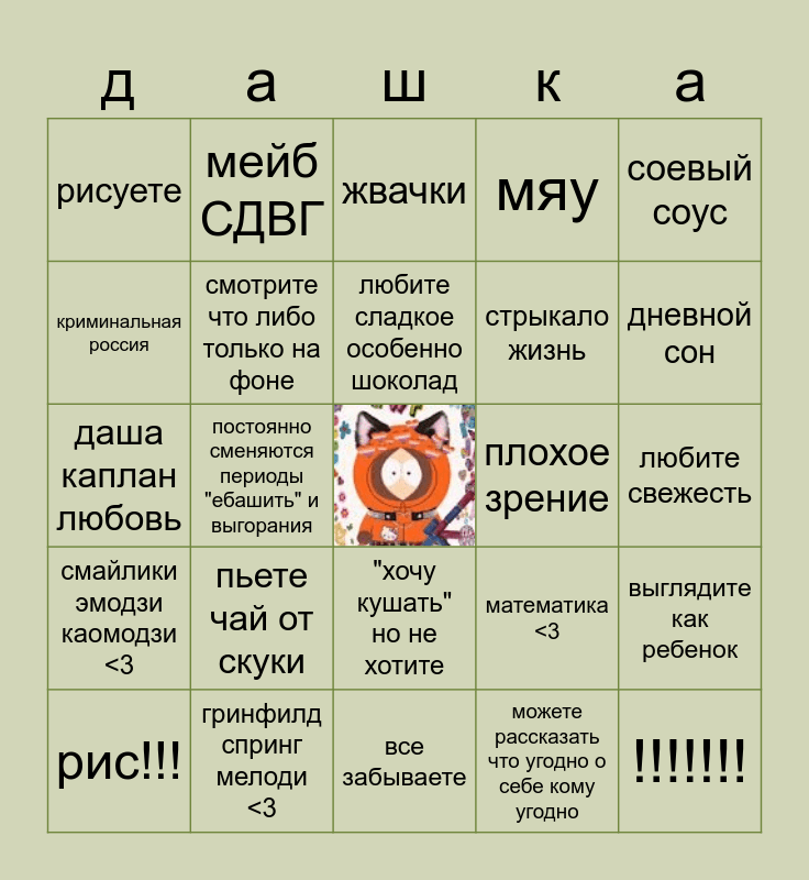 This bingo card has a free space and 24 words: пьете чай от скуки, гринфилд спринг мелоди <3, любите сладкое особенно шоколад, рис!!!, соевый соус, рисуете, криминальная россия, мейб СДВГ, плохое зрение, "хочу кушать" но не хотите, стрыкало жизнь, даша каплан любовь, математика <3, выглядите как ребенок, смотрите что либо только на фоне, можете рассказать что угодно о себе кому угодно, любите свежесть, жвачки, дневной сон, постоянно сменяются периоды "ебашить" и выгорания, !!!!!!!, смайлики эмодзи каомодзи <3, мяу and все забываете.