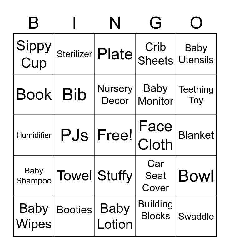 This bingo card has a free space and 29 words: Baby Wipes, Diapers, PJs, Pacifier, Sippy Cup, Plate, Bib, Towel, Face Cloth, Booties, Blanket, Swaddle, Baby Lotion, Building Blocks, Teething Toy, Nail Trimmer, Stuffy, Baby Shampoo, Baby Utensils, Humidifier, Car Seat Cover, Socks, Baby Monitor, Book, Crib Sheets, Sterilizer, Bowl, Nursery Decor and Baby Safety Equipment.