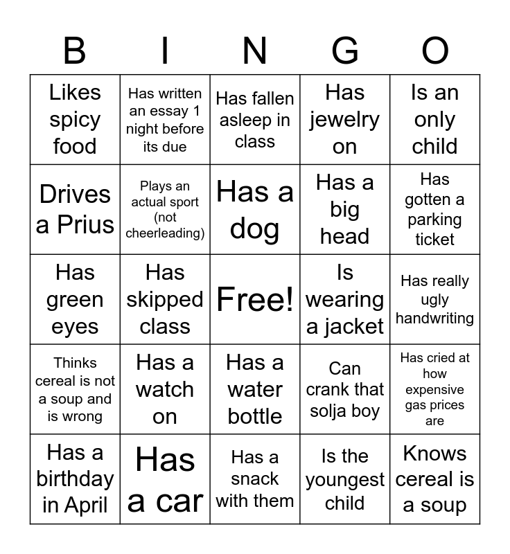 This bingo card has a free space and 24 words: Has a watch on, Has a car, Has a dog, Has a birthday in April, Is an only child, Likes spicy food, Drives a Prius, Has written an essay 1 night before its due, Is wearing a jacket, Has a water bottle, Has a big head, Has green eyes, Can crank that solja boy, Has cried at how expensive gas prices are, Plays an actual sport (not cheerleading), Is the youngest child, Has really ugly handwriting, Has fallen asleep in class, Has gotten a parking ticket, Has skipped class, Knows cereal is a soup, Thinks cereal is not a soup and is wrong, Has jewelry on and Has a snack with them.