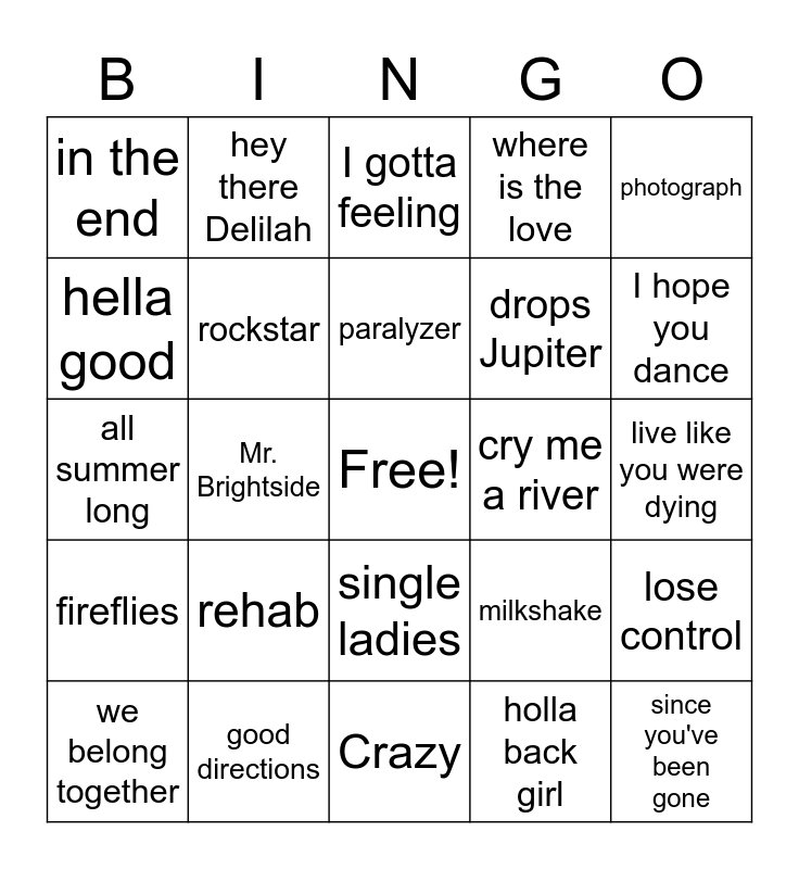 This bingo card has a free space and 29 words: we belong together, drop it like its hot, Mr. Brightside, low, in the end, I gotta feeling, rockstar, rehab, cry me a river, good directions, live like you were dying, since you've been gone, Crazy, holla back girl, I hope you dance, save a horse ride a cowboy, single ladies, fireflies, photograph, all summer long, milkshake, Empire State of mine, drops Jupiter, hella good, where is the love, hey there Delilah, lose control, paralyzer and can't get you out of my head.