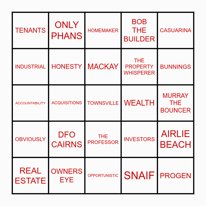 This bingo card has 25 words: DFO CAIRNS, OPPORTUNISTIC, MACKAY, REAL ESTATE, CASUARINA, TENANTS, INDUSTRIAL, ONLY PHANS, WEALTH, THE PROFESSOR, THE PROPERTY WHISPERER, ACCOUNTABILITY, INVESTORS, AIRLIE BEACH, HONESTY, PROGEN, MURRAY THE BOUNCER, HOMEMAKER, BUNNINGS, ACQUISITIONS, TOWNSVILLE, OWNERS EYE, OBVIOUSLY, BOB THE BUILDER and SNAIF.