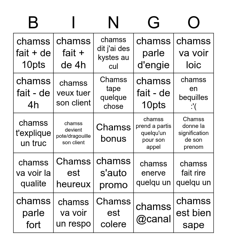 This bingo card has 25 words: Chamss est heureux, Chamss est colere, Chamss tape quelque chose, chamss parle fort, chamss va voir loic, chamss fait + de 10pts, chamss fait - de 4h, chamss fait + de 4h, chamss prend a partis quelqu'un pour son appel, chamss s'auto promo, chamss fait - de 10pts, chamss t'explique un truc, chamss enerve quelqu un, chamss fait rire quelqu un, chamss veux tuer son client, chamss est bien sape, Chamss donne la signification de son prenom, chamss dit j'ai des kystes au cul, chamss en bequilles :'(, chamss devient pote/dragouille son client, Chamss bonus, chamss va voir un respo, chamss va voir la qualite, chamss parle d'engie and chamss @canal.