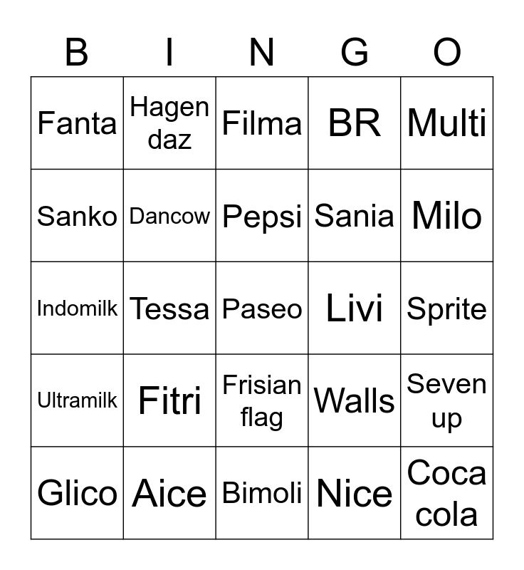 This bingo card has a free space and 24 words: Fitri, Aice, Pepsi, Glico, Multi, Fanta, Sanko, Hagen daz, Livi, Frisian flag, Sania, Indomilk, Walls, Seven up, Dancow, Nice, Sprite, Filma, Milo, Tessa, Coca cola, Ultramilk, BR and Bimoli.