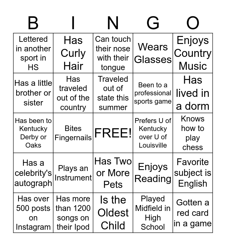 This bingo card has a free space and 24 words: Plays an Instrument, Has more than 1200 songs on their Ipod, Traveled out of state this summer, Has over 500 posts on Instagram, Enjoys Country Music, Lettered in another sport in HS, Has a little brother or sister, Has Curly Hair, Prefers U of Kentucky over U of Louisville, Has Two or More Pets, Been to a professional sports game, Has been to Kentucky Derby or Oaks, Enjoys Reading, Favorite subject is English, Has traveled out of the country, Played Midfield in High School, Knows how to play chess, Can touch their nose with their tongue, Has lived in a dorm, Bites Fingernails, Gotten a red card in a game, Has a celebrity's autograph, Wears Glasses and Is the Oldest Child.