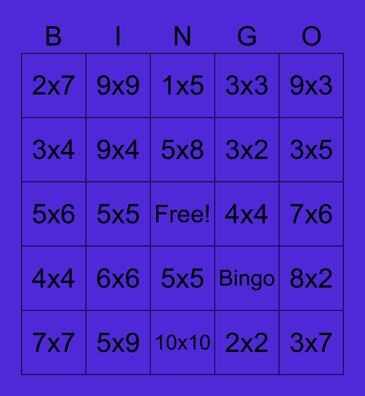 This bingo card has a free space and 25 words: 6x6, 10x10, 5x8, 7x7, 9x3, 2x7, 3x4, 9x9, 4x4, 5x5, 3x2, 5x6, Bingo, 8x2, 9x4, 4x8, 7x6, 1x5, 3x5, 5x5, 3x7, 5x9, 4x4, 3x3 and 2x2.