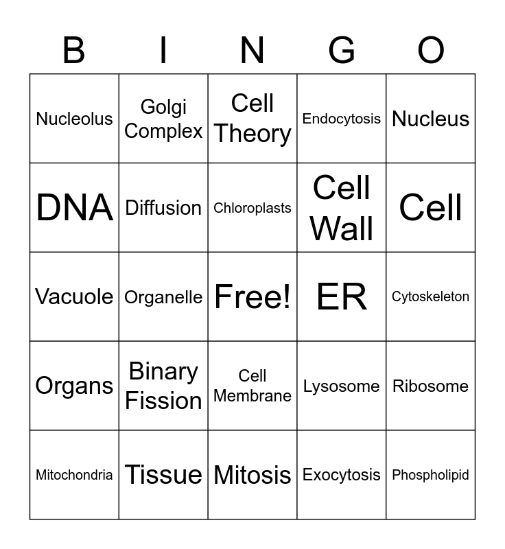 This bingo card has a free space and 25 words: Binary Fission, Mitosis, Chloroplasts, Mitochondria, Nucleus, Nucleolus, DNA, Golgi Complex, ER, Cell Membrane, Cell Wall, Vacuole, Lysosome, Ribosome, Diffusion, Homeostasis, Cytoskeleton, Cell Theory, Cell, Organelle, Phospholipid, Tissue, Organs, Endocytosis and Exocytosis.