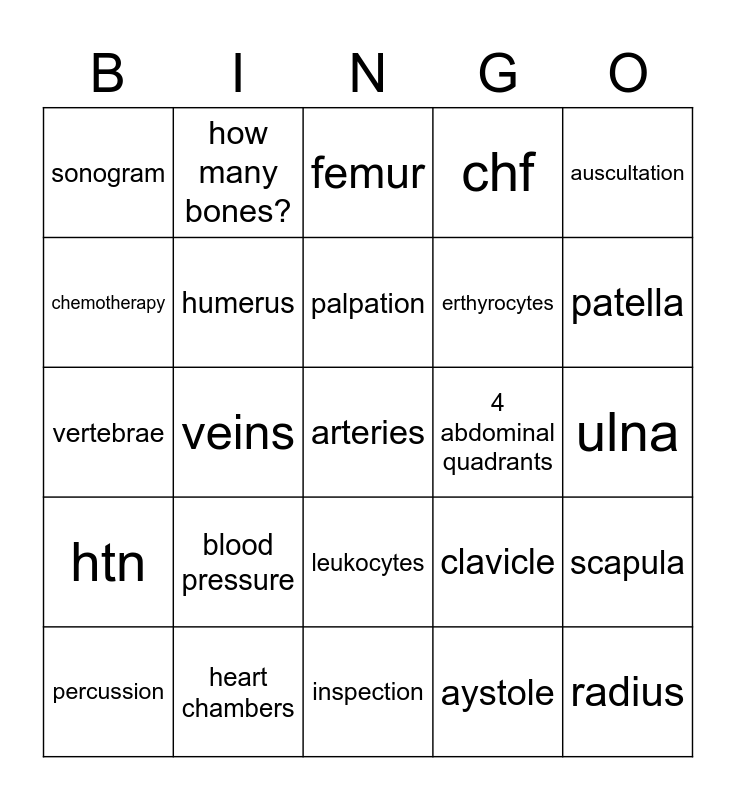 This bingo card has 25 words: blood pressure, inspection, palpation, percussion, auscultation, sonogram, chemotherapy, how many bones?, 4 abdominal quadrants, leukocytes, erthyrocytes, vertebrae, clavicle, scapula, humerus, radius, ulna, femur, patella, veins, arteries, heart chambers, htn, chf and aystole.