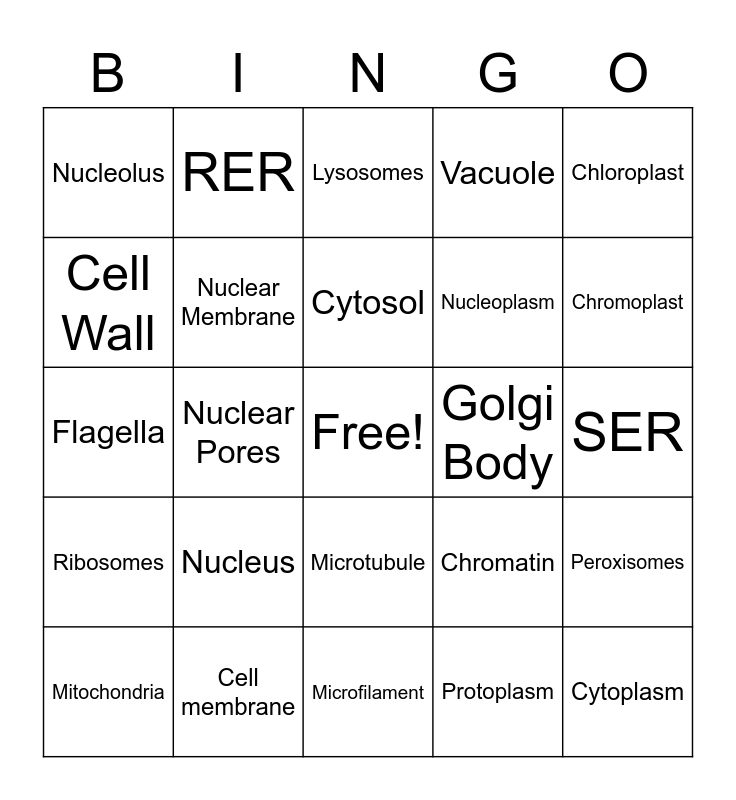 This bingo card has a free space and 24 words: Nucleus, Cell membrane, Cytosol, Mitochondria, Chloroplast, Nucleolus, Cell Wall, RER, Golgi Body, Microtubule, Nucleoplasm, Flagella, Chromatin, Peroxisomes, Nuclear Membrane, Protoplasm, SER, Lysosomes, Chromoplast, Nuclear Pores, Cytoplasm, Ribosomes, Vacuole and Microfilament.