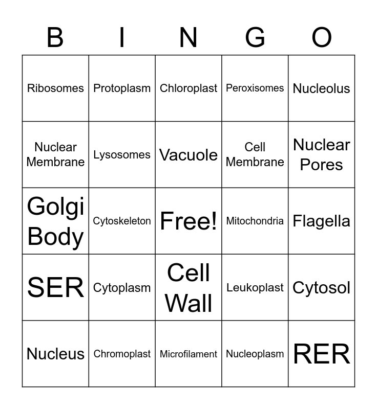 This bingo card has a free space and 24 words: Cytoplasm, Chromoplast, Vacuole, Nucleus, Nucleolus, Ribosomes, Nuclear Membrane, Protoplasm, Mitochondria, Cell Wall, Cell Membrane, Golgi Body, Leukoplast, Cytosol, Lysosomes, Nucleoplasm, Flagella, Chloroplast, Nuclear Pores, Cytoskeleton, RER, SER, Peroxisomes and Microfilament.